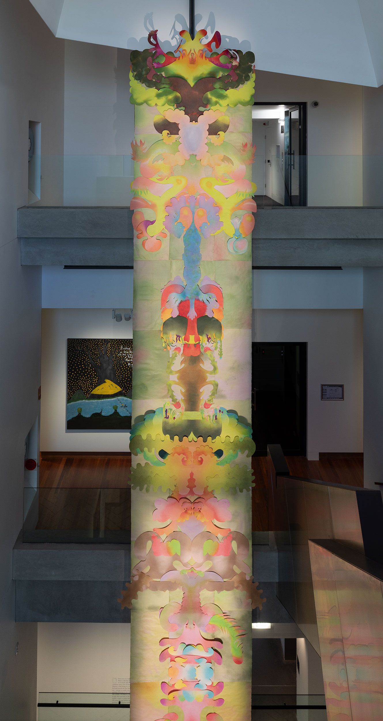 This new piece – a second skin over an existing architectural feature– is a layered, plant-like construction echoing paper’s role as an intermediary between the natural and human worlds. Each colour-saturated piece recalls petals, leaves, and the internal architectures of flowers. As the shapes are superposed, they form a vertical organism that seems to grow upward – part dress, part spine, part devotional object.