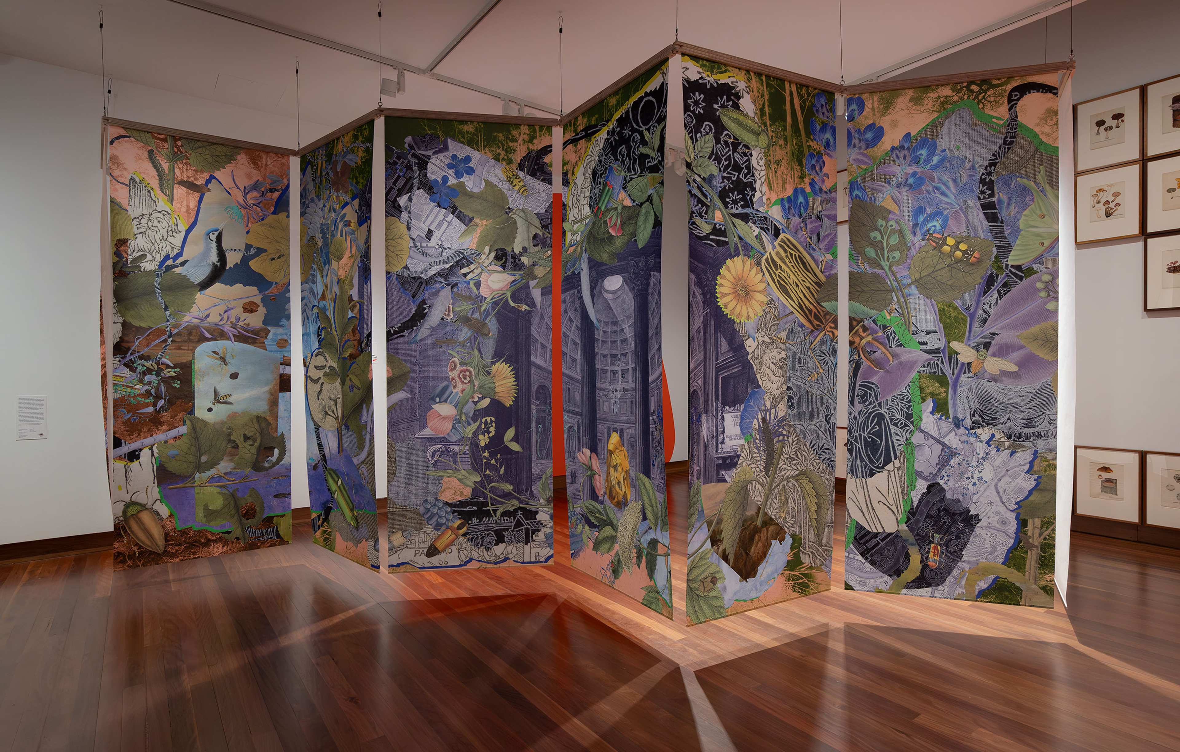 Gracia Haby and Louise Jennison’s work, commissioned for this exhibition, is dedicated to the velvet ants of Australia. A series of suspended folding screens compose a digital collage rooted in the artists’ long-standing practice with natural-history research, paper, print and collage. The format allows them to conceive a pedagogical, narrative work that integrates rare book natural history illustrations and science, while also reflecting on their ongoing engagement with nature and biodiversity. The format has a function: it becomes a handmade transmission machine. Fold by fold, panel by panel, Haby and Jennison tell and show moments in the history and behaviour of a given species – the velvet ant. Engagement, commitment, and the desire that all of us might participate more actively in the lives of animals and plants, animate a practice that insists on better, more attentive forms of coexistence.