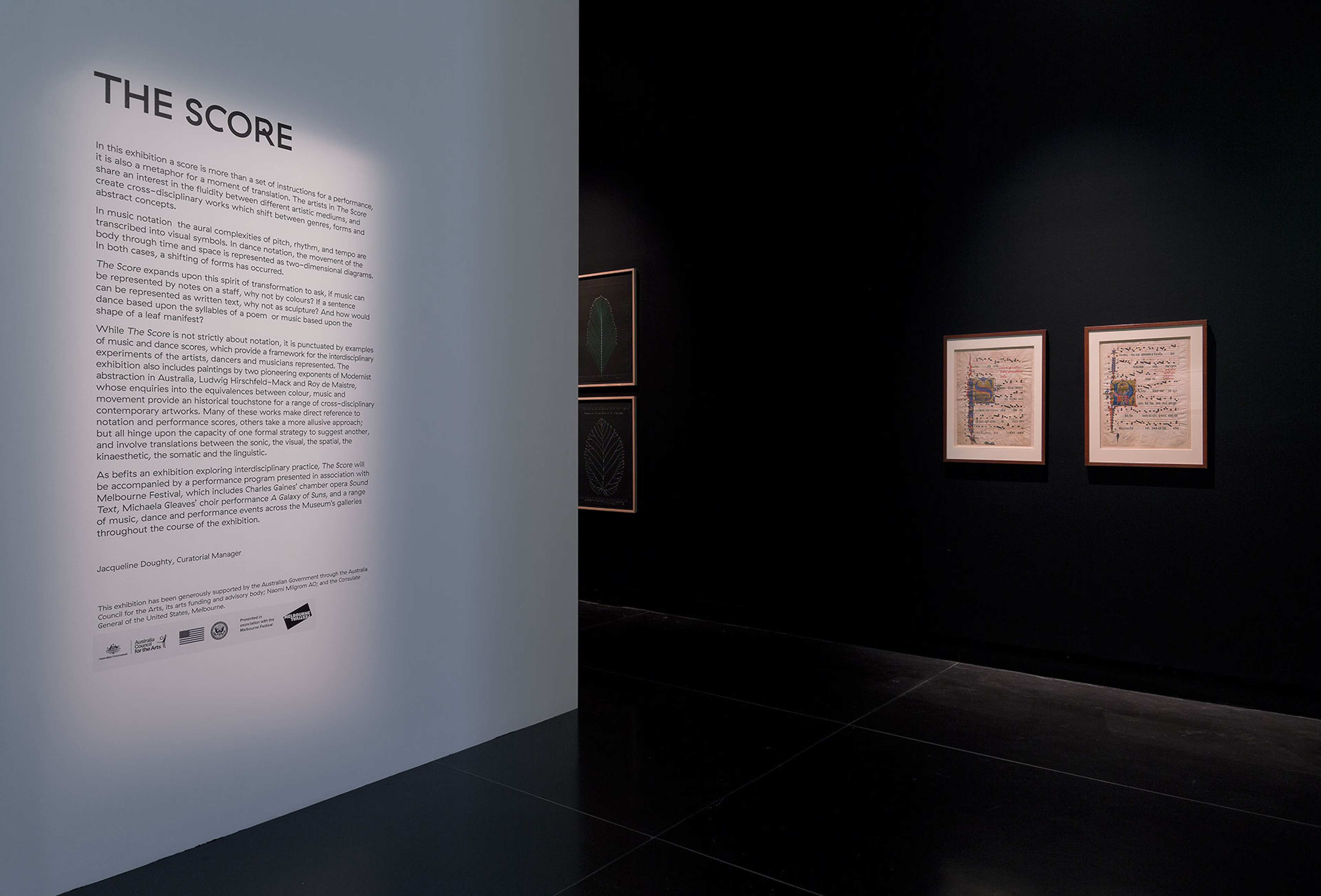 Spanning all three floors of the Potter, the exhibition included examples of music and dance notation from Medieval manuscripts through to graphic notation of the 1960s alongside artworks and performances. The colour music experiments of Modernist abstract painters such as Roy de Maistre and Ludwig Hirschfeld-Mack complemented a more recent series of works by John Nixon, whose paintings were ‘played’ by a musical ensemble as part of a performance in the gallery. Influential composer John Cage’s movable scores made of Plexiglas and acetate sat alongside Marco Fusinato's drawings that compress Cage’s Water Music score into one moment. Performance videos by Yuki Kihara and Christine Sun Kim & Thomas Mader explored the communicative potential of hand gestures. Sriwhana Spong translated a diary text by ballet dancer Vaslav Nijinsky into choreography, while Nathan Gray transformed the composer Cornelius Cardew’s epic graphic score Treatise into sculpture.